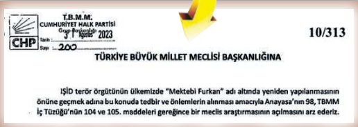 CHP, 2023’te TBMM’ye verdiği önerge ile IŞİD terör örgütünün Türkiye’de “Mektebi Furkan” adı altında yeniden yapılandığını belirtti ve araştırılmasını istedi. Önergede “Yalova” diye nokta da verilerek “Merkezi Yalova’da yer alan, Gürcistan’da da temsilciliği bulunan ‘Ahlak ve Sünnet Dergisi’ çevresinde toplanan grubun taban kazanmak ve silahlı eğitim için dirsek temasında bulunduğu vurgulandı.