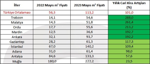 Yıllık kira artış oranı İstanbul’da yüzde 109,4, Ankara’da yüzde 192,2, İzmir’de ise yüzde 150 olarak öne çıktı.