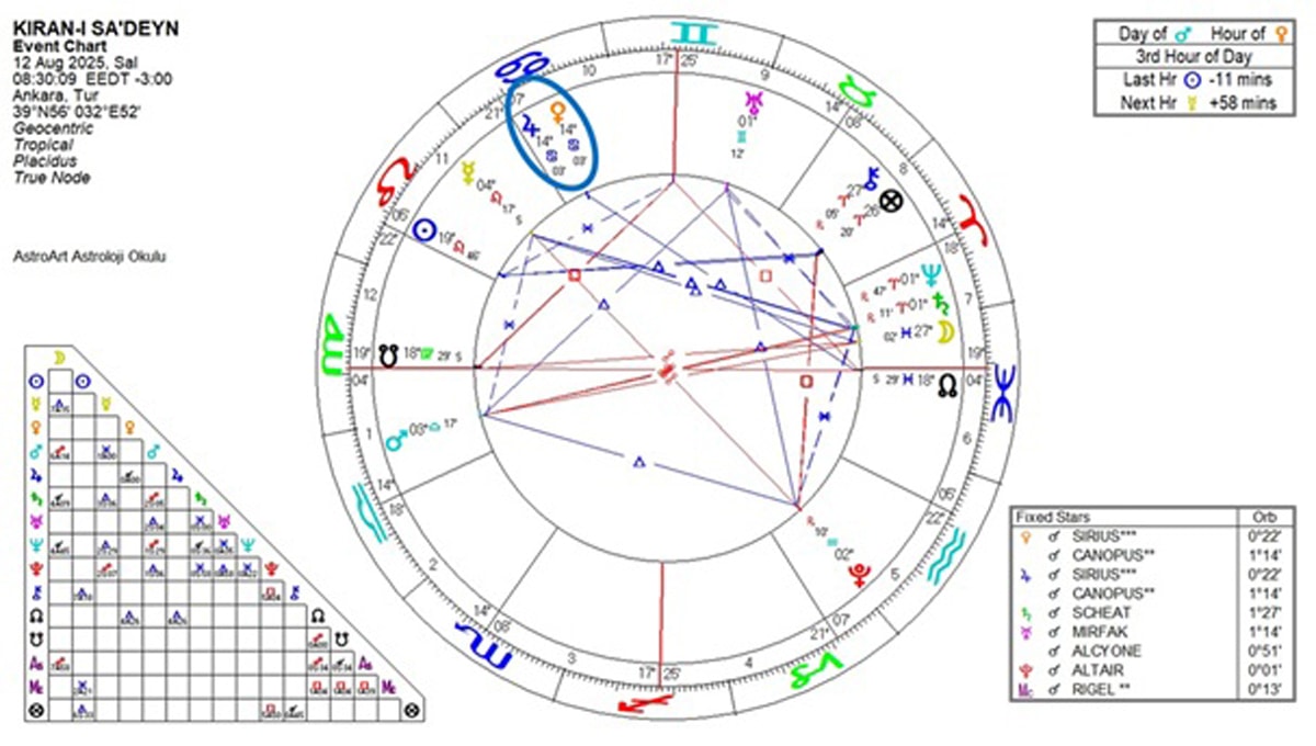 Güneşmerkezli gezegen geometrisine baktığımızda, 10 Ağustos civarında stresli açıların etkili olduğunu görüyoruz. Bu tarih civarında etkili güneş aktivitesi ve jeomanyetik fırtınalar olasıdır. Sismik aktivitede artış, etkili deprem olasılığı da yüksektir. Bu konuda tahminlerim için tıklayınız https://www.youtube.com/watch?v=vlwfaD2FYA0&t=14s