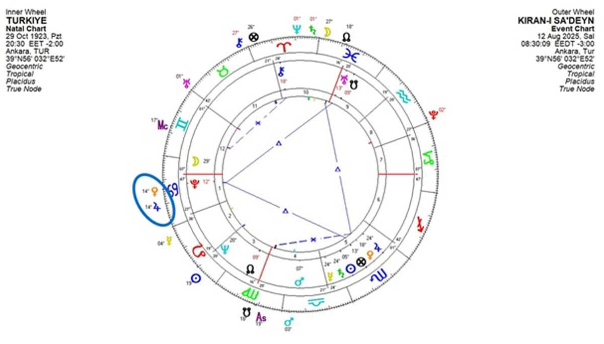 Uğurlu Venüs-Jüpiter kavuşumu ülkemiz astroloji haritasının halkı temsil eden 1.hanesini etkiliyor. Dolayısıyla halkla ilgili konularda sağlık ve esenlik getiren, biraz olsun rahatlatan, iyimserleştiren bir enerji akışını bizlere taşıyor. Jüpiter’in ve Venüs’ün ülkemiz haritasındaki yerleşimi gereği, bu kavuşumla beraber bize taşıyacağı olumlu gelişmeler şu alanlarda olabilir: Gençler ve çocuklarla ilgili konular, ülkelerarası aracılık ve arabuluculuk misyonumuzla ilgili gelişmeler, borsa, spekülatif işler, turizm, sportif faaliyetler, sanatsal ve kültürel faaliyetler. Aşağıda Türkiye astroloji haritası üzerine yansımasını görmektesiniz.