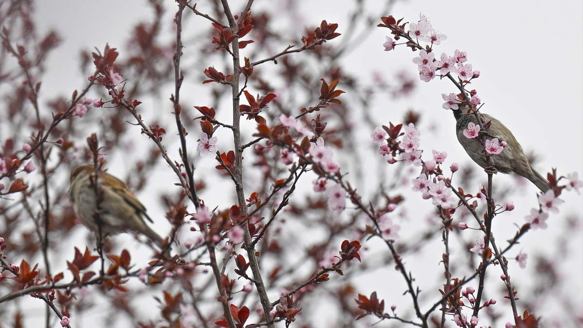 Kiraz ağaçlarının beyaz ve pembe çiçekleri, dallara konan serçeler ile birlikte güzel görüntüler oluşturdu.