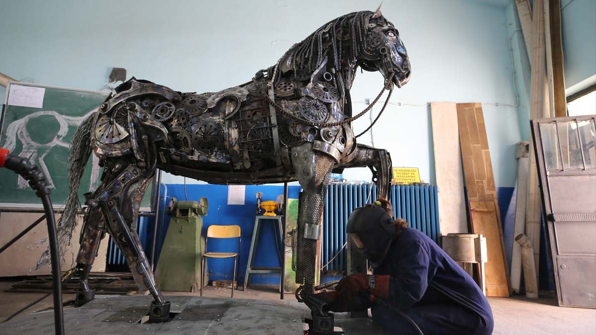 Mimar Sinan Mesleki ve Teknik Anadolu Lisesi metal atölyesinde atın iskeletini oluşturan Can, topladığı malzemeleri atın görünümüne uygun olacak şekilde kaynattı.