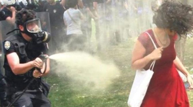 Dosyadaki görüntülere ilişkin hazırlanan bilirkişi raporunda, "Kırmızılı kadın" isimli klasördeki videonun incelendiği belirtilerek, "Videoda bir polis memurunun hemen önünde duran arkası polise dönük olan kırmızı elbiseli kadın da dahil olmak üzere hedef gözetmeksizin önüne gelene gaz sıkmak suretiyle alanda koşuşturduğu görülmüştür" ifadelerine yer verildi.