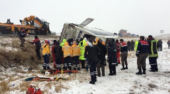 Salih GÜNERKIRŞEHİR, (DHA)- KIRŞEHİR yakınlarında, buzlanma nedeniyle kayarak kontrolden çıkan yolcu otobüsü, şarampole devrildi. Kazada 7 kişi öldü, 4`ü ağır 22 kişi de yaralandı. Kazada ağır yaralanan 2 yolcunun duran kalplerinin, ambulansta ve hastanede yapılan müdahalelerle tekrar çalıştırıldığı açıklandı.