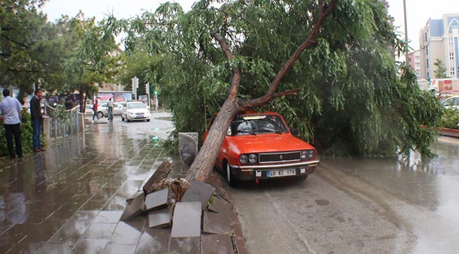 Lise Caddesi ve Güldiken Mahallesi'nde rüzgar nedeniyle ağaçlar park halindeki otomobillerin üzerine devrildi, araçlarda hasar meydana geldi.
