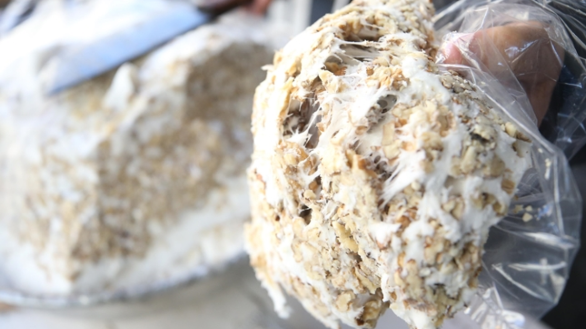 Şeker ve çöven kökü buluşmasından sonra karışıma bölgenin en kaliteli cevizleri ilave ediliyor. Cevizlerin helvanın her zerresine nüfuz etmesi için acele edilmeden bekletilen karışım, bu uzun dinlenme süresinde gerçek lezzetine ve ideal dokusuna erişiyor.