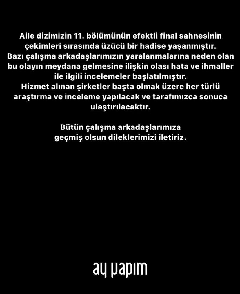 'Aile' dizisinin çekimlerinde meydana gelen kazada bazı set çalışanları yaralandı. Konuyla ilgili yapım şirketi açıklama yaptı.