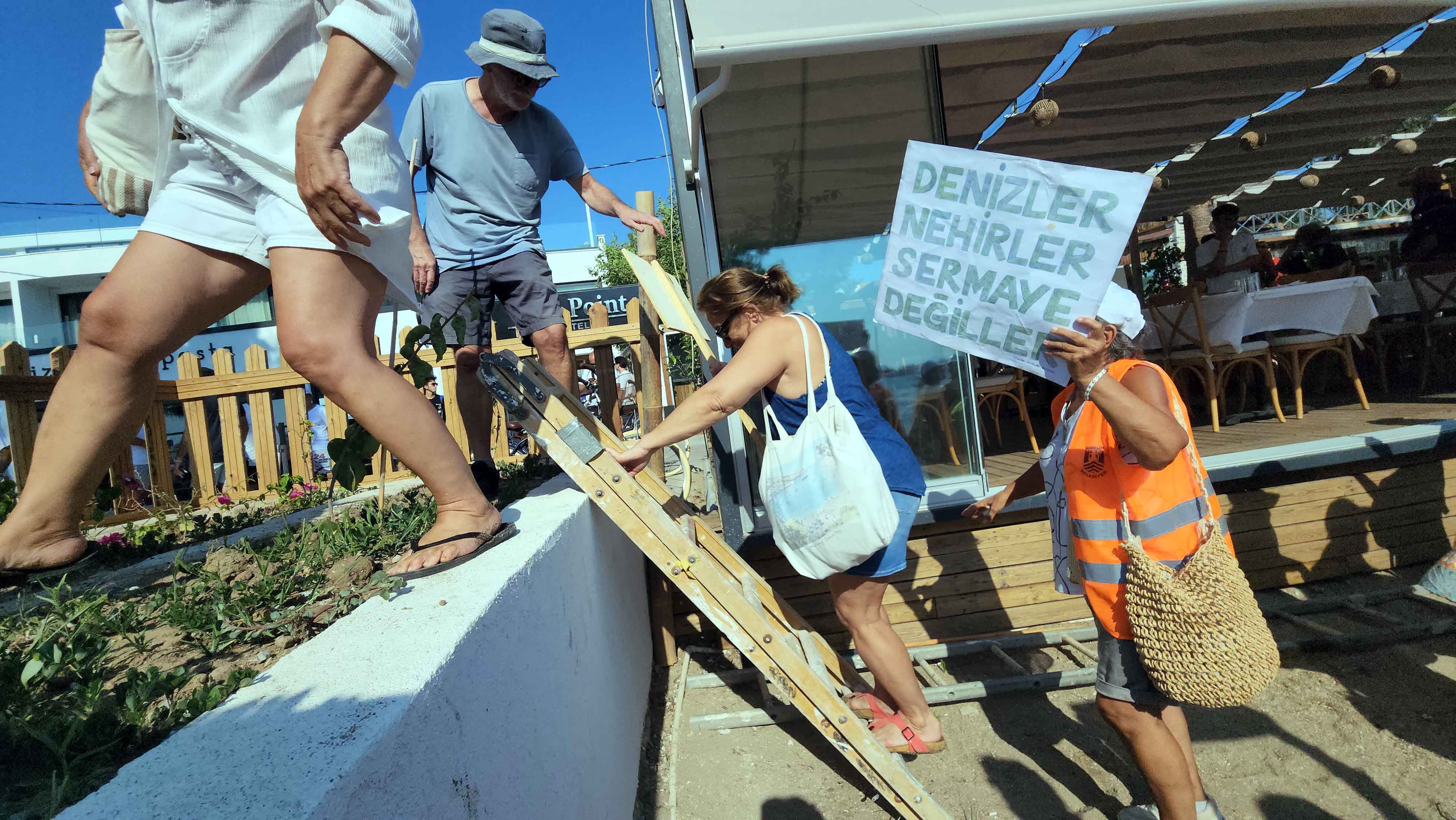 Halk plajının ortasında denizin içine kadar çekilen duvarı eylemciler merdiven dayayarak geçebildi. Eylemcilere plajda güneşlenen yerli turistlerde alkışlarla destek verdi.