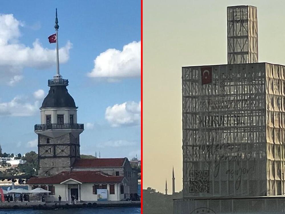 Yakın zamanda bir vatandaşın kamerasına yansıyan görüntülerde kamuflaj altındaki tarihi kulenin son hali görüldü.
