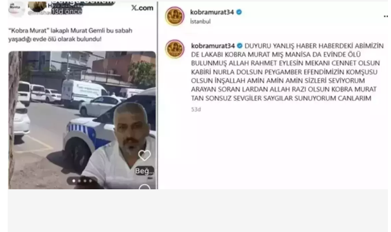 "Duyuru yanlış haber. Haberdeki abimizin de lakabı 'Kobra Murat' imiş. Manisa'da evinde ölü bulunmuş. Allah rahmet eylesin mekanı cennet olsun, kabri nurla dolsun. Peygamber efendimizin komşusu olsun inşallah. Sizleri seviyorum. Arayan, soranlardan Allah razı olsun. Kobra Murat'tan sonsuz sevgiler, saygılar sunuyorum canlarım"