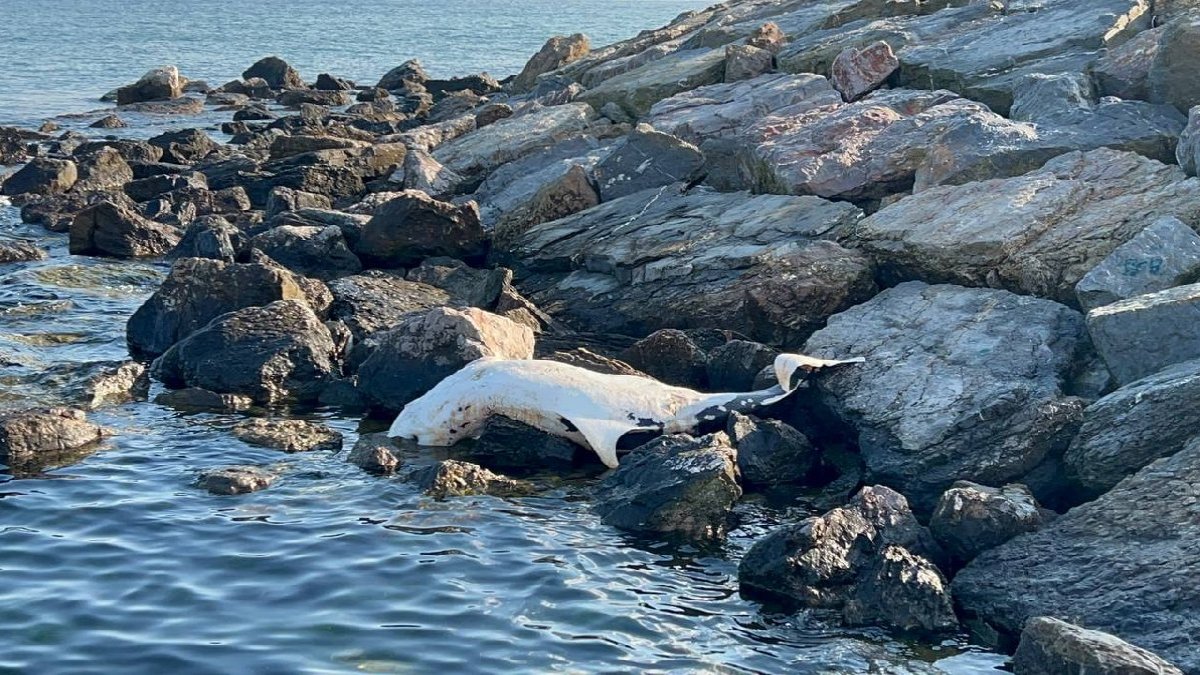 Bayramoğlu Mahallesi Balyoz Koyu'nda, devriye görevi yapan güvenlik güçleri, kayalıklarda ölü yunus olduğunu fark etti.