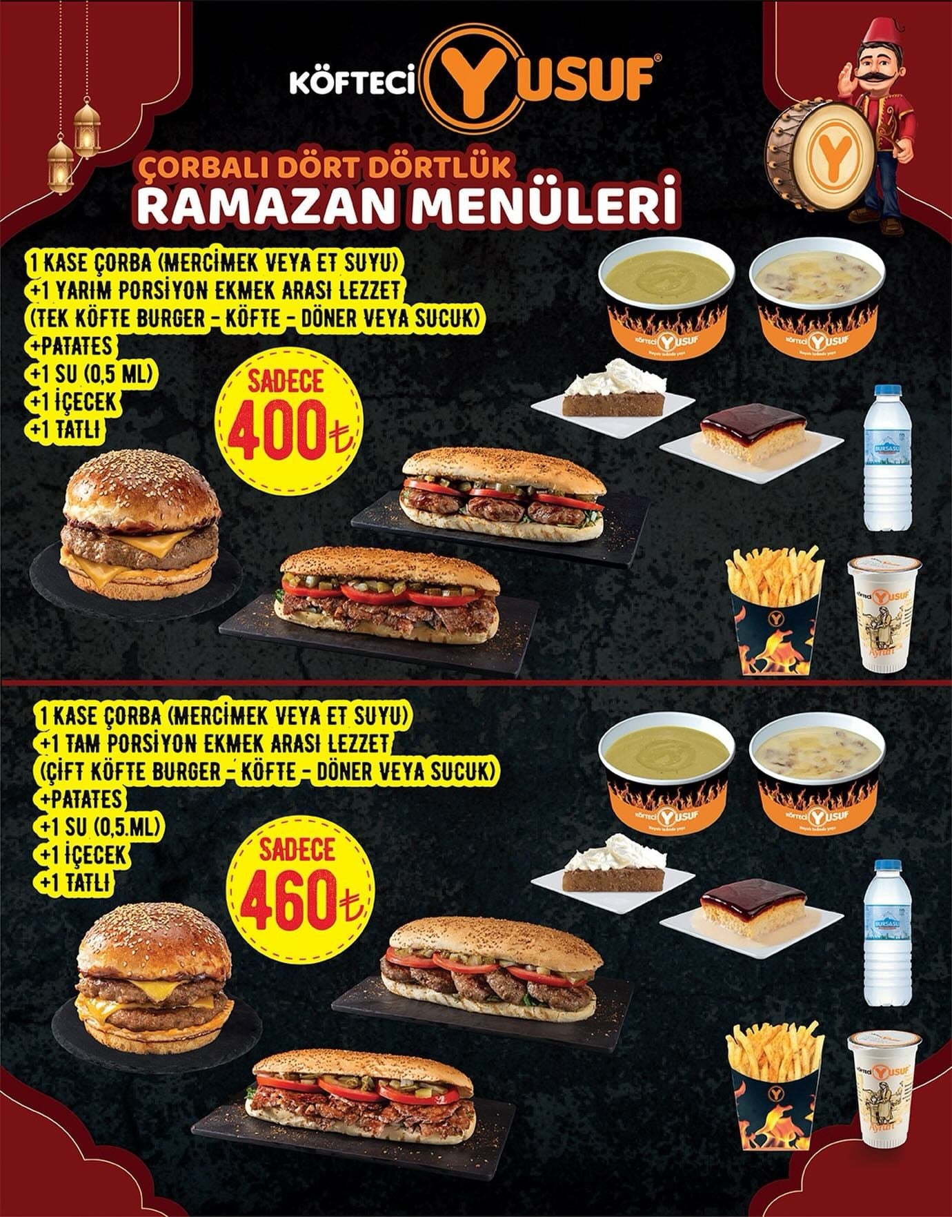 Türkiye'nin en büyük restoran zincirleri arasında yer alan Köfteci Yusuf, 2026 yılında geçerli olacak iftar menüsünde müşterilere iki farklı seçenek sunarken, menülerin fiyatları 400 ve 460 TL olarak belirlendi.