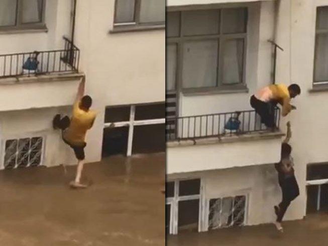 Üst kattan oturan komşuları balkondan sarkıtılan ipe tutunan Töngel, 1'inci katın balkonuna çıktı. Fatma Töngel de ardından aynı ipe tutunarak eşinin de yardımıyla yanına çıktı. O anlar ise bir başka komşusu tarafından saniye saniye kayıt edildi. (İHA)