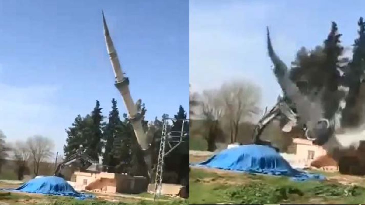 Karar sonrası yıkım için minare, halat bağlanıp iş makinesiyle çekildi. Bu sırada minare, iş makinesinin üzerine devrildi.