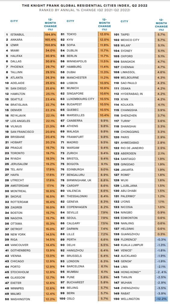 Türk şehirlerinin listede zirvede yer alması raporda, enflasyonun yüzde 80'e ulaşması, artan inşaat maliyetleri ve arz eksikliğine bağlandı.