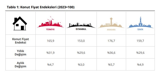 İstanbul, Ankara ve İzmir’in konut fiyat endekslerindeki gelişmeler değerlendirildiğinde, 2024 yılı Aralık ayında bir önceki aya göre, sırasıyla yüzde 2,1, 2,0 ve 0,4 oranlarında artış gözlendi.