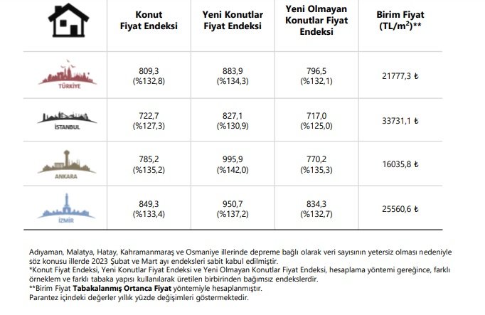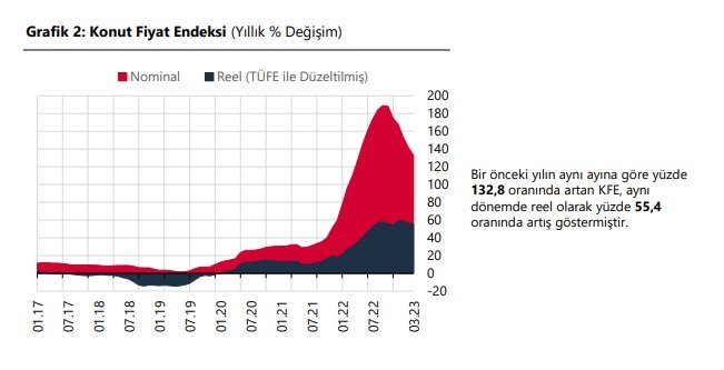 Konut fiyatları şubatta yüzde 141,5, ocakta yüzde 153,1 artmıştı. Böylece konut fiyatlarının artış hızındaki yavaşlama mart ayında da sürmüş oldu.