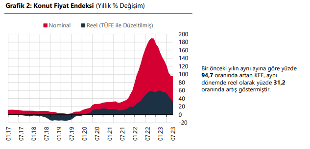 2023 yılı temmuz ayında bir önceki aya göre yüzde 7,3 oranında artan KFE, bir önceki yılın aynı ayına göre nominal olarak yüzde 94,7, reel olarak ise yüzde 31,2 oranında arttı.