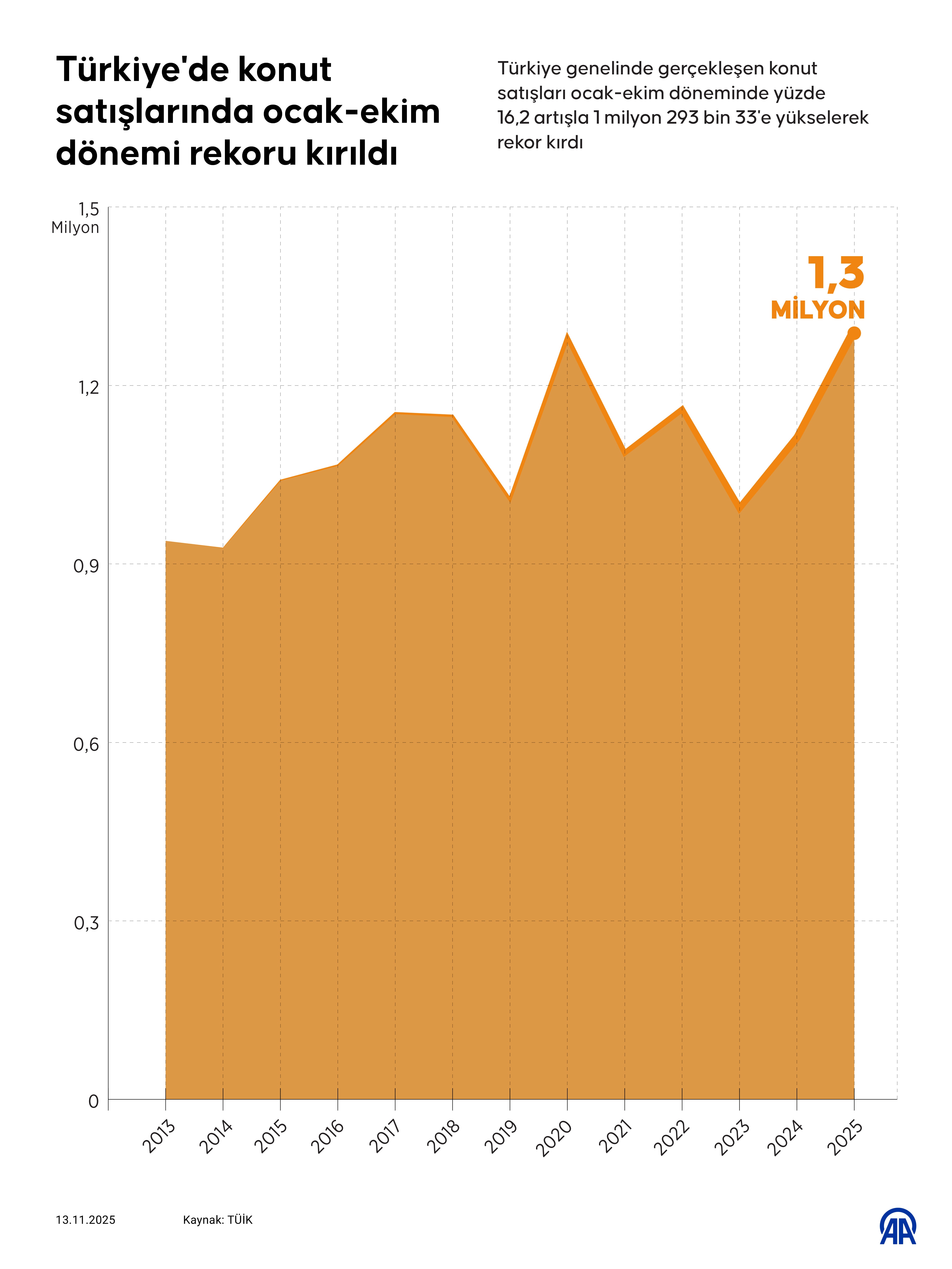 Konut satışları ocak-ekim döneminde yıllık bazda yüzde 16,2 artarak 1 milyon 293 bin 33'e yükseldi. Bu rakam tüm zamanların en yüksek ocak-ekim dönemi verisi olarak kayıtlara geçti. Bundan önceki en yüksek rakam 1 milyon 280 bin 852 adetle 2020 yılında görülmüştü.