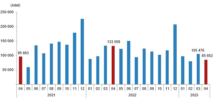 Buna göre, Türkiye genelinde konut satışları nisan ayında bir önceki yılın aynı ayına göre yüzde 35,6 azalarak 85 bin 652 oldu.