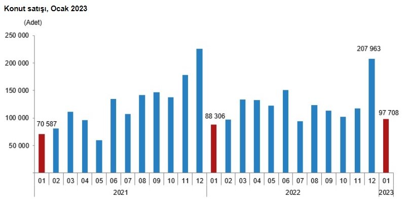Buna göre, Türkiye genelinde konut satışları ocak ayında bir önceki yılın aynı ayına göre yüzde 10,6 artarak 97 bin 708 oldu.