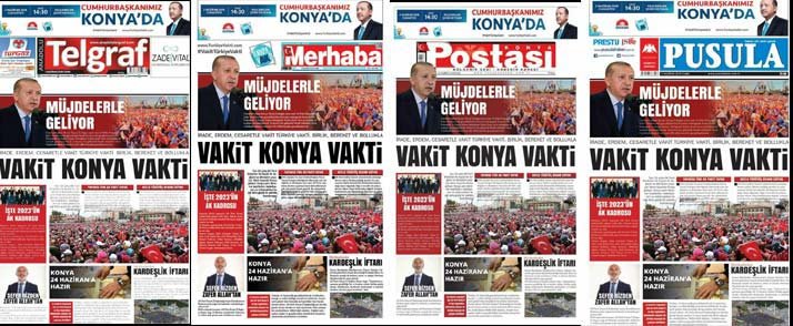 Cumhurbaşkanı Erdoğan'ın bugün kente geleceğinin haberini verildiği gazetelerin aynı safya düzeni ile çıktığı gözlendi. İşte sadece logoları farklı olan gazetelerden bir bölümü..