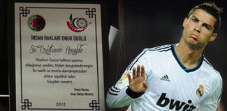 Real Madrid'in Portekizli oyuncusu Cristiano Ronaldo'nun, altın ayakkabısını satarak elde ettiği 1,5 milyon Euroyu Filistin'e bağışlamasının ardından Konya Barosu İnsan Hakları Merkezi Başkanı avukat İsmail Üresin, PTT kanalıyla 2012 İnsan Hakları Onur Ödülü plaketini gönderdi. Avukat İsmail Üresin yaptığı açıklamada şöyle dedi:"İnsan Hakları Onur Ödülü için Filistinli kardeşlerimize yönelik İsrail'in saldırısı devam etmektedir. Bu saldırılara karşı uzaklardan vicdanının sesini dinleyen bir ses bizlere tercüman olmuştur. Real Madrid'in Portekizli Dünyaca ünlü futbolcusu Cristiano Ronaldo altın ayakkabısını satışa çıkarmak suretiyle Filistin'e 1,5 milyon euro yardım göndermiştir. Ronaldo'nun yapmış olduğu bu yardım herkesin takdirini kazanmıştır. Biz de Konya Barosu İnsan Hakları Merkezi olarak 2012 İnsan Hakları Onur Ödülü'nü kendisine vermeyi uygun gördük. Kendisinin Filistin'le herhangi dil din, bir soy bağı bulunmamasına rağmen, tamamen vicdani bir sorumluluk hissiyle hareket ederek böylesine bir yardım yapması hepimizi duygulandırmıştır."