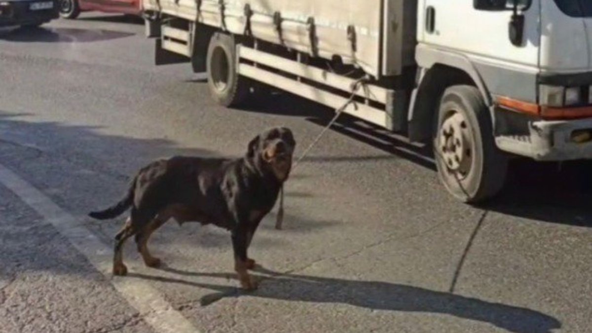 Görüntülerde, kamyonun arkasında iple bağlı halde ilerleyen köpeğin zorlanıp düştüğü görülüyor.