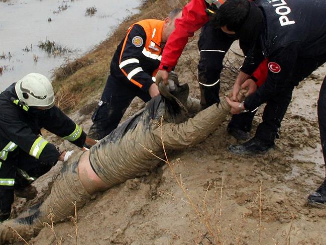 Düştüğü dere yatağında çamura saplanan Sarı gece boyunca yardım bekledi. Foto: DHAAFAD VE İTFAİYE EKİPLERİ KURTARDI