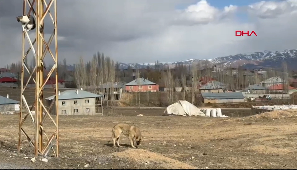 Başkale ilçesi Tepebaşı Mahallesi'nde köpek kaçan kedi, elektrik direğine tırmandı.