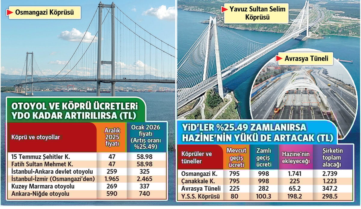İktidar yeni yıla sayılı günler kala düşük enflasyon hedeflerini sık sık tekrarlayarak asgari ücrete yapılacak zammı açlık sınırı seviyesinde tutmaya çalışıyor. Ancak buna karşılık vatandaşın ödeyeceği ücretlerde herhangi bir indirime gitmiyor. Son olarak köprü ve otoyol ücretlerinde bu durum yaşandı. Ulaştırma ve Altyapı Bakanı Abdulkadir Uraloğlu devletin işlettiği köprü ve otoyollara yüzde 25.49’luk yeniden değerleme oranında (YDO) zam yapıldığını duyurdu.Yapılan zam ile İstanbul’daki 15 Temmuz Şehitler Köprüsü ve Fatih Sultan Mehmet Köprüsü ücretleri 47TL’den 58.98 TL’ye yükseldi. Şirketlerin işlettiği köprüler de aynı oranda zamlanırsa Yavuz Sultan Selim Köprüsü 80 TL’den 100 TL’ye Osmangazi Köprüsü 795 TL’den 998 TL’ye, Avrasya Tüneli 225 TL’den 282 TL’ye çıkacak.