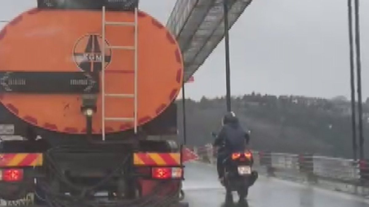 İstanbul'da etkili olan rüzgar nedeniyle motosiklet sürücüleri zor anlar yaşadı. Fatih Sultan Mehmet Köprüsü'nden geçerken zorlanan motosiklet sürücüsünün yardımına tanker şoförü yetişti. Şoförün tankerle motosiklete kalkan olduğu anlar bir başka sürücü tarafından cep telefonu kamerasıyla görüntülendi.