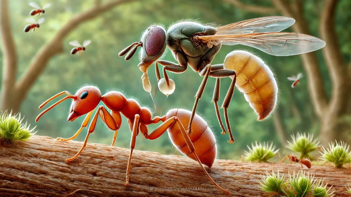 Süreç, sineğin işçi karıncayı uzaktan izlemesiyle başlıyor. Dişi sinek, karıncaya yaklaşarak yumurtasını karıncanın gövdesine bırakıyor. Yumurtadan çıkan larva birkaç gün içinde karıncanın gövdesinden başına geçiyor. Bu aşamada larva, karıncanın bağışıklık sisteminden kurtulmak için hızla hareket ediyor.