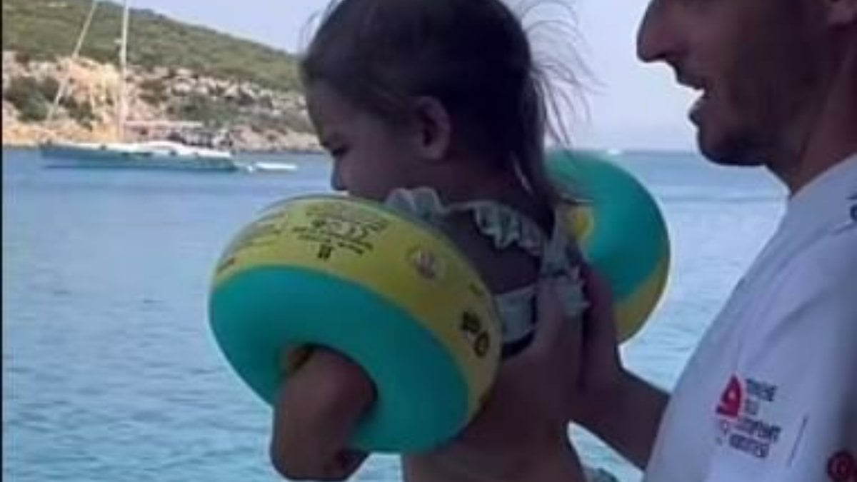 Şişirilebilir mavi ve sarı kolluklar takan kız, aileden olduğu tahmin edilen bir adam tarafından teknenin korkuluklarında tutuldu.