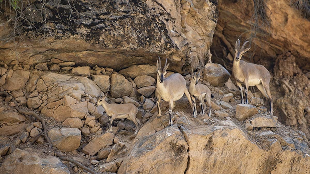 Yavrularıyla milli parktaki kayalıklarda gezinen yaban keçileri, belirli aralıklarla meşe ağaçları ve bitkilerle besleniyor.