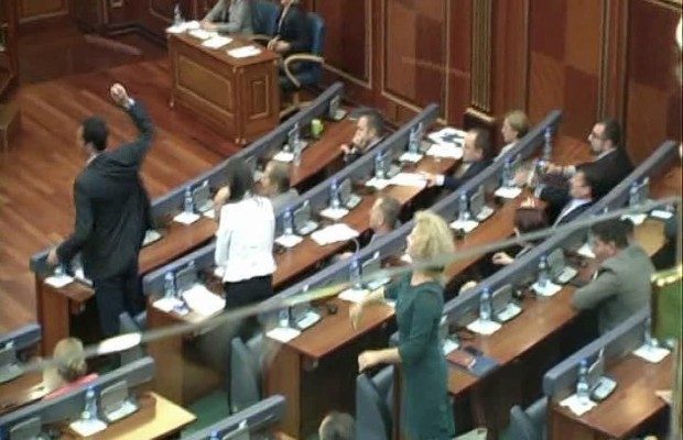 Kosova Meclisi genel kurul toplantısında Kosova Başbakanı İsa Mustafa, Avrupa Birliği'nin arabuluculuk ettiği diyalog çerçevesinde Kosova ile Sırbistan arasında Brüksel'de imzalanan anlaşmalar üzerine bilgi verdiği sırada muhalefet partilerinin milletvekilleri, Mustafa'yı yumurta yağmuruna tuttular.