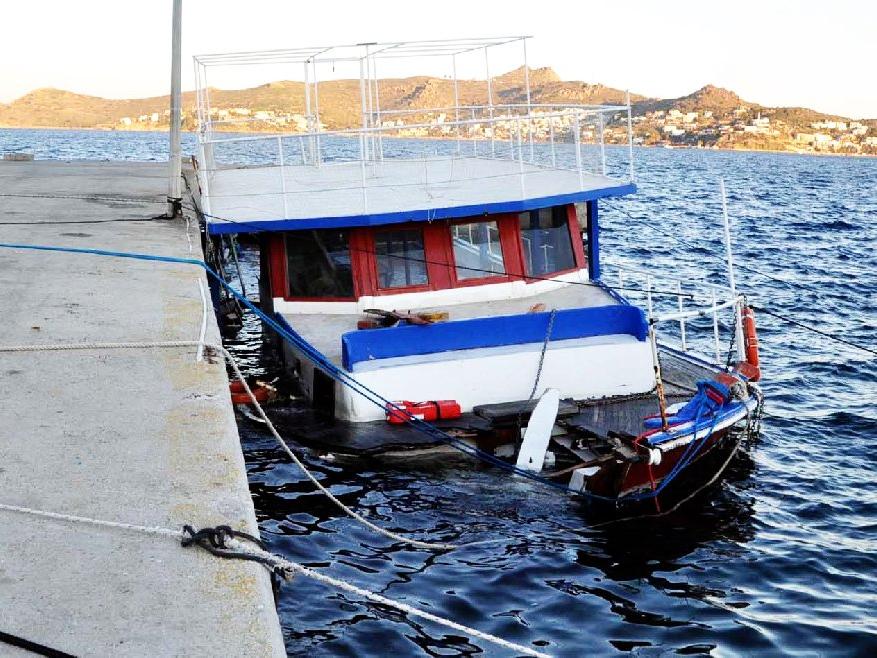 Muğla'nın Bodrum ilçesinde kötü hava koşulları ve şiddetli rüzgar nedeniyle iskeleye bağlı bulunan 21 metre uzunluğundaki tur teknesi parçalanarak battı.