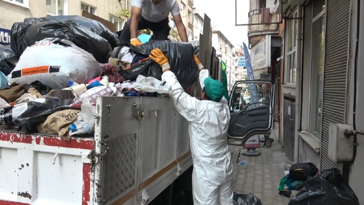 Evin temizlenmesi için çalışma başlatan belediye ekipleri, 3 kamyon atığı evden çıkardı. Daire, temizlik çalışmasının ardından ilaçlandı.
