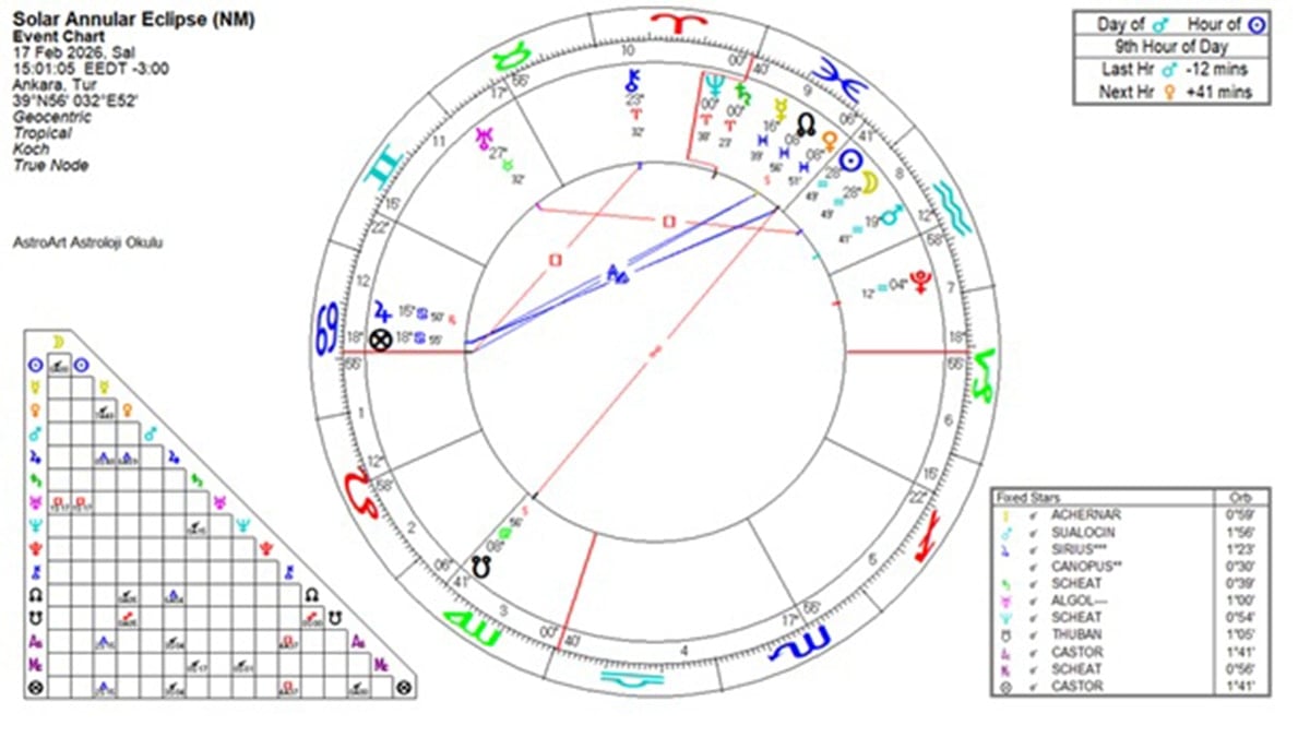 17 Şubat Salı günü gerçekleşecek olan Güneş tutulması Türkiye için çıkartılmış astroloji haritasında saat 15.01’i gösteriyor. Bu haritada en dikkat çeken şey yine Mars’ın yönlendirici gezegen olarak askeri konulara, sert, gergin etkilere işaret ediyor olması. Güneş tutulması 28 derece Kova burcunda meydana gelecek. Dolayısıyla entelektüel, zihinsel konularda önemli gelişmelere de işaret ediyor. Astroloji derecesi olarak tanımlanan 27 dereceye çok yakın iz düştüğü için de astroloji üzerinde de bazı önemli etkileri olabilir.