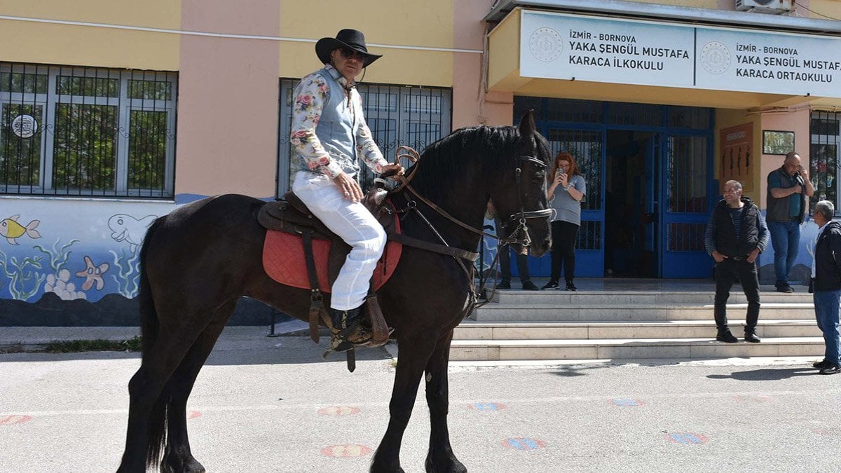 Faruk Ceren, oy kullanacağı Bornova Yaka Şengül Mustafa Karaca İlkokulu'na at üstünde kovboy kıyafeti ile geldi.