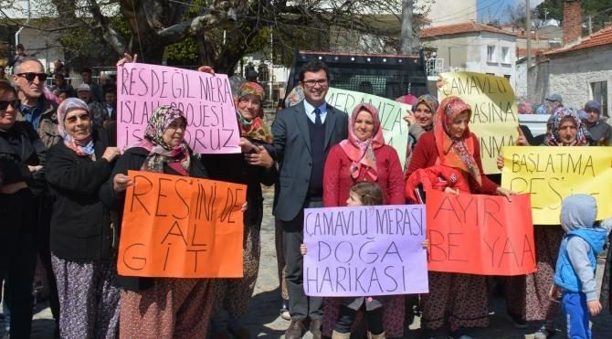 Köylülere eşlik eden CHP'li Bergama Belediye Başkanı Mehmet Gönenç, Çamavlu'da ana geçim kaynağının hayvancılık olduğunu belirterek, "Geçtiğimiz yıllarda bu merada TEMA Vakfı, günümüzde de Tarım İl Müdürlüğü tarafından 'mera ıslah projesi' yürütülüyor. Devletin ıslah projesi yürüttüğü bu kadar önemli bir alanda şimdi RES yapılmak isteniyor. Biz rüzgardan yapılacak enerjiye, güneşten elde edilecek enerjiye karşı değiliz. Ancak yer seçimlerinin hassasiyetle yapılması gerekiyor. Buradaki doğal yaşama, hayvancılığa, meracılığa zarar verecek bu şirketin faaliyetine tüm köylüler karşı. Biz de onların bu mücadelesine destek vermek için buradayız. Burada yapılmasını uygun bulmuyoruz. Başka bir alanda bu yatırımın yapılması ülke ekonomisi açısından daha doğru olacak" dedi.