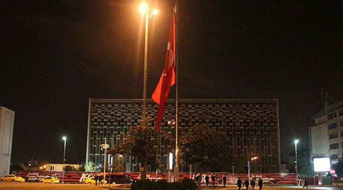 Bir günlük milli yas nedeniyle Taksim'deki dev Türk bayrağı gece saatlerinde yarıya indirildi.
