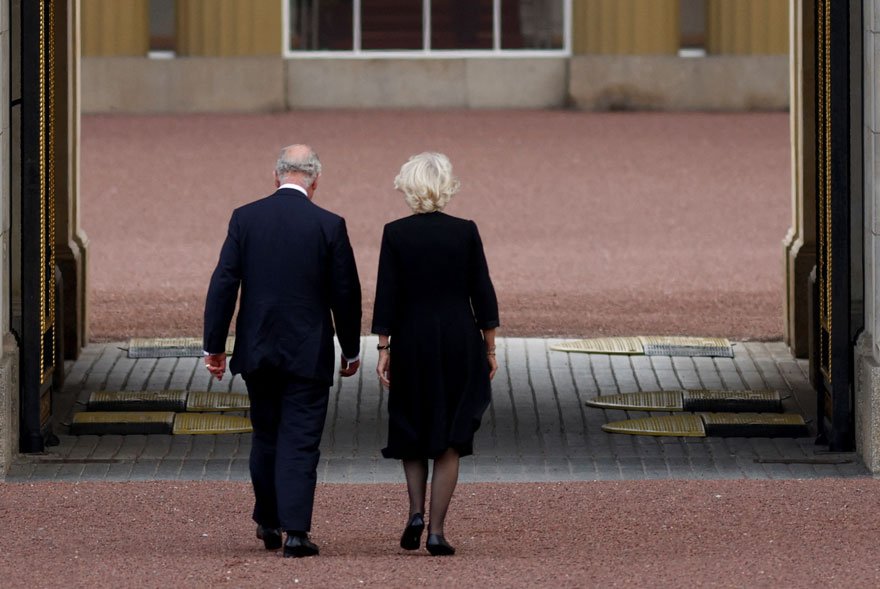 Sarayın önünde taziye dileklerini sunan onlarca İngiliz vatandaşıyla konuşan ve Kral Charles tek tek onlarca insanla tokalaştı. Charles'a Konsort Kraliçe unvanını alan Camilla da eşlik etti. Çiftin simsiyah giyindiği görülürken, Charles ve Camilla'ya çok yoğun destek tezahüratı geldi.