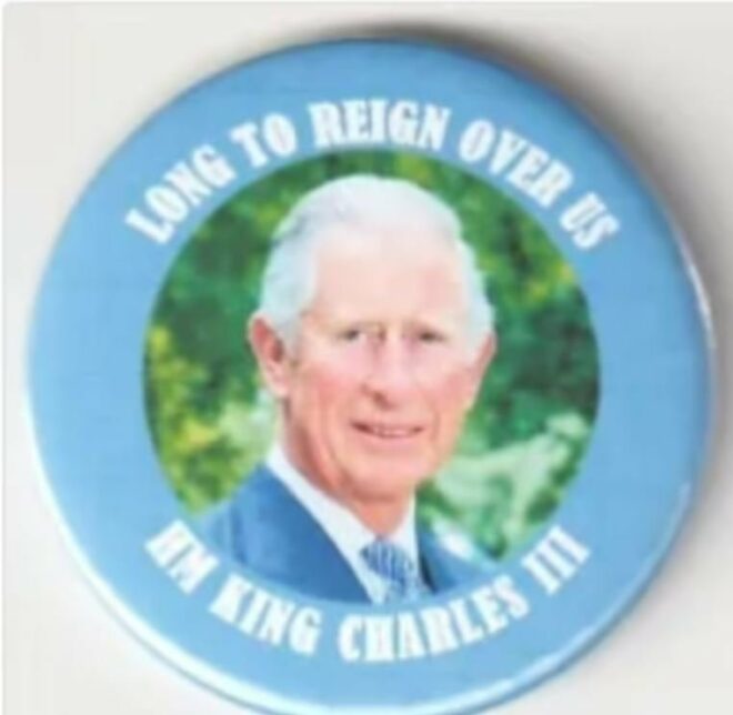 Yine Kral III. Charles'ın yer aldığı bir rozet de 84 TL'ye (3,99 sterlin) satılıyor, üzerinde Kral'ın bir fotoğrafı ve "Üzerimizde hüküm sürmesi çok uzun, Tanrı Kralı korusun" sözleri yer alıyor.