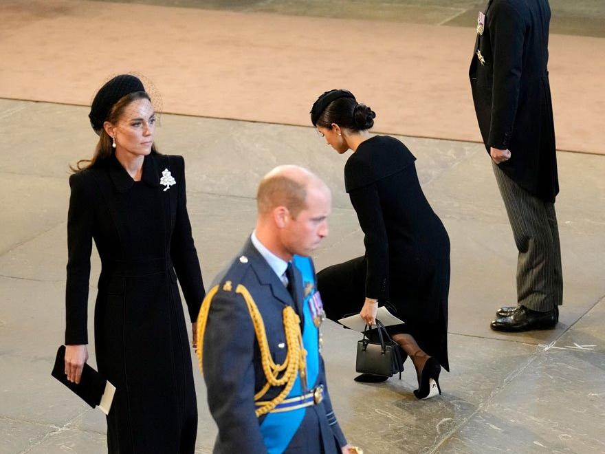 Kraliyet ailesine adeta savaş açarak ABD'ye yerleşen Prens Harry ve eşi Meghan Markle da dün Londra'daydı... Kraliçe'nin huzuruna çiçek bırakan Meghan Markle eğilirken siyah topuklu ayakkabısının tabanındaki işaret kafaları karıştırdı.
