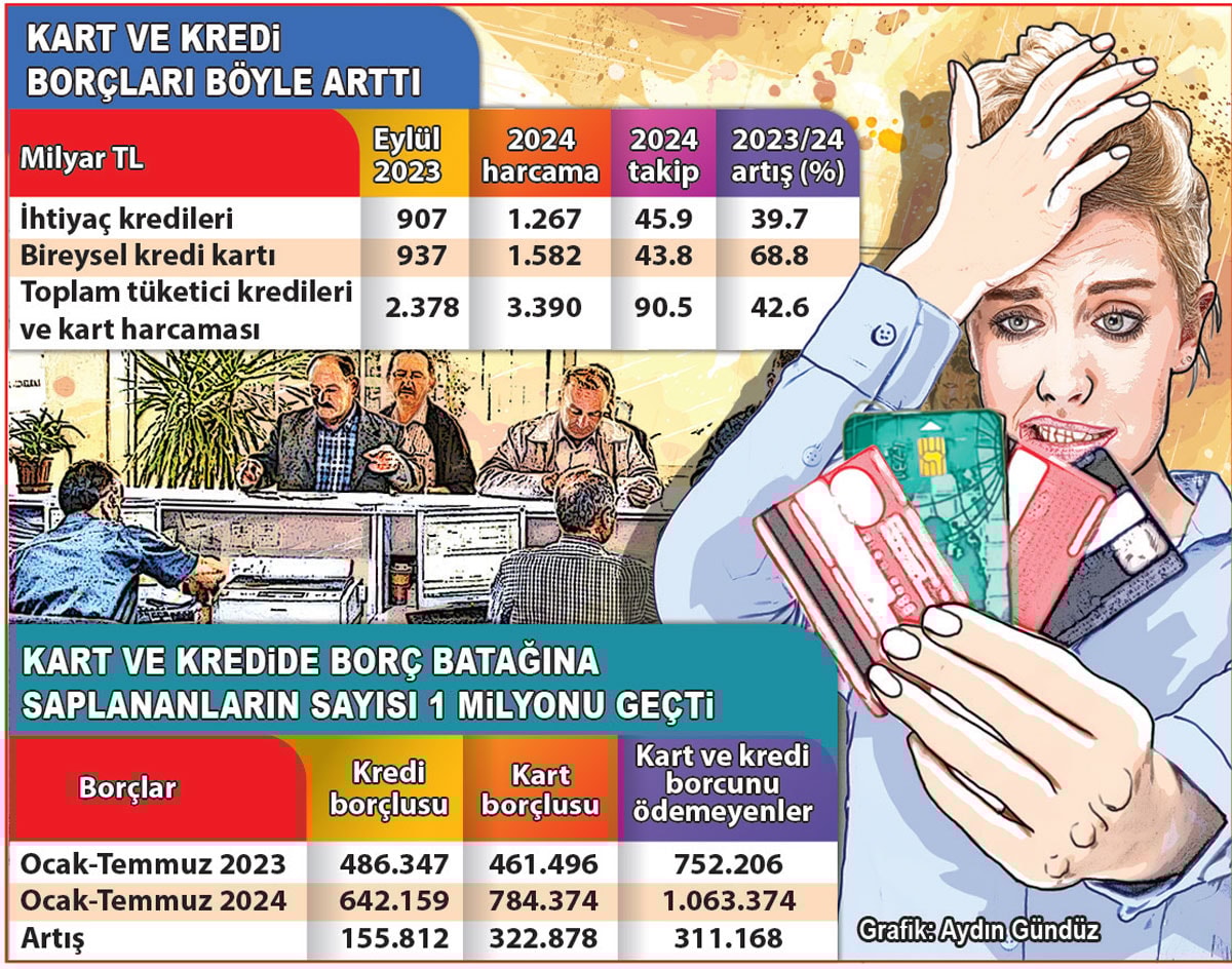İktidar, hayat pahalılığını azdırıp maaşları erittiği için kredi kartı ve ihtiyaç kredilerini ödeyemez hale düşen milyonlarca dar gelirliye borç yapılandırma paketi açtı. Kredi kartının asgari tutarını ödeyemeyenlerle ihtiyaç kredisi borcunda takibe düşen dar gelirliler bu borçlarını 60 ay vadeye yayarak 5 yılda ödeyebilecekler. Temmuz sonu itibarıyla bankalara 642 bin kişi 46 milyar TL’lik ihtiyaç kredisi borcunu, 784 bin kişi de 44 milyar liralık kredi kartı borcunu ödeyemediği için takibe düştü. Borcunu ödeyemeyenlerin sayısı son bir yılda 311 binden fazla arttı. Bu artışta asgari ücrete temmuz ayında zam yapılmaması etkili oldu. İktidarın sürpriz adımla borç yapılandırma kararı almasının arka planında, önümüzdeki dönemde Anayasa değişikliği için referandum sandığını halkın önüne getirme planlarının yattığı da iddia ediliyor.