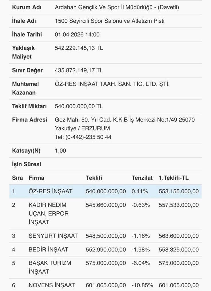 Türkiye'des ekonomik kriz etkisini sürdürürken, kamu ihalelerinde tercih edilen yöntemlere yönelik tartışmalar da büyüyor. Muhalefetin kamu ihalelerinde şeffaflık eleştirileri sürerken, Ardahan’da yapılması planlanan spor tesisi ihalesinin sınırlı katılımla gerçekleştirilmesi dikkat çekti. Yaklaşık maliyeti 542 milyon 229 bin 145 TL olan proje için düzenlenen ihaleye sadece belirlenen firmalar çağrıldı.
