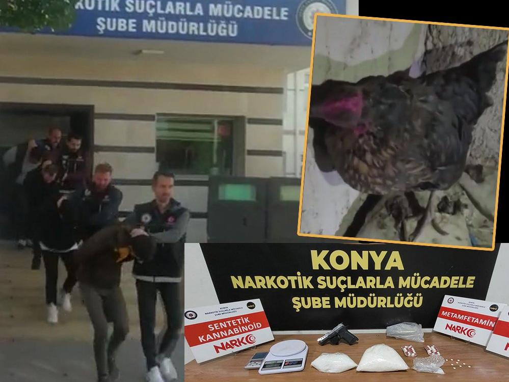Konya'da polisin düzenlediği operasyonda, kümeste bir tavuğun altındaki bölüme gizlenmiş 824 gram metamfetamin ile 38 uyuşturucu hap ele geçirildi.