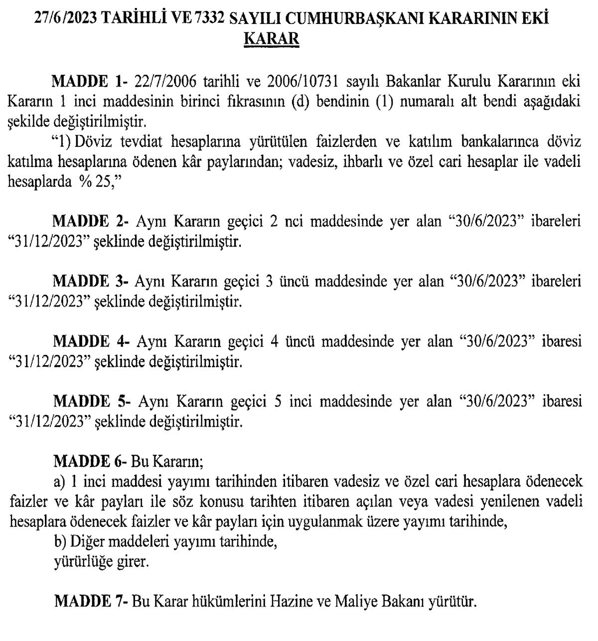 Resmi Gazete'de yayımlanan karar ile; Kur Korumalı Mevduat hesaplarına uygulanan stopaj istisnası 31 Aralık 2023 tarihine kadar uygulanacak. Döviz tevdiat hesaplarına uygulanan stopaj oranı ise yüzde 25'e yükseltildi.