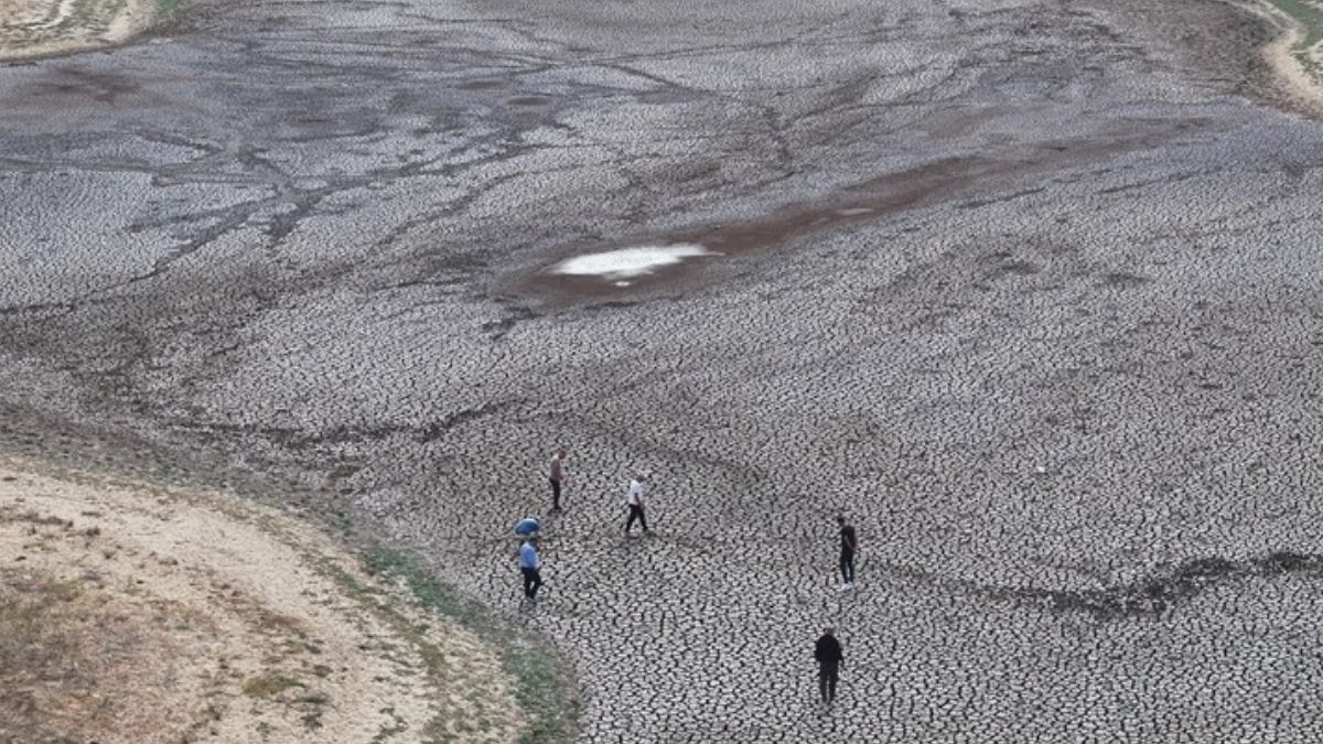 Kuruma nedeniyle göletin tabanında derin çatlaklar oluştu, besiciler farklı su kaynaklarından hayvanlarını sulamaya çalışıyor.